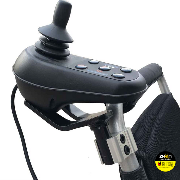 Met deze beugel kan de bedieningseenheid aan de duwstang van de elektrische rolstoel worden bevestigd. Hierdoor kan een verzorger de opvouwbare, lichtgewicht elektrische rolstoel *EXTREME* bedienen en controleren.