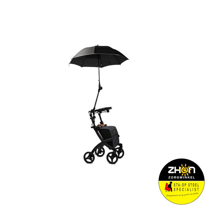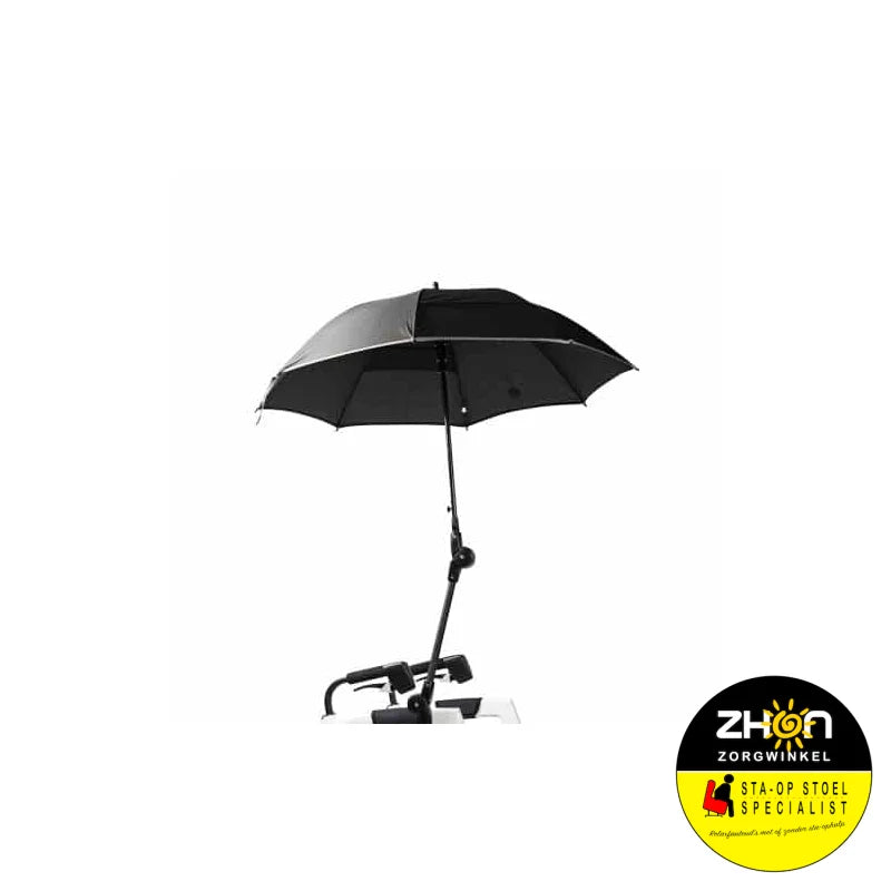 Paraplu: Deze is verstelbaar en wordt op het frame gemonteerd. Zo blijf je droog (of uit de zon) terwijl je beide handen aan de handgrepen houdt voor optimale stabiliteit.
